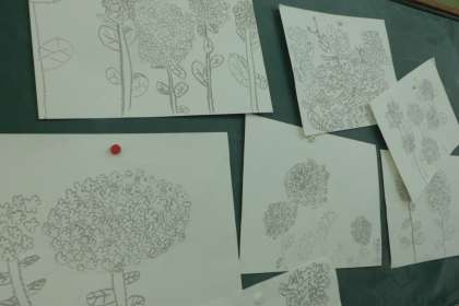 図工の時間に学校に咲いているあじさいを見ながら絵を描きました。「小さいお花がいっぱい集まってる」「形はふんわり丸いね」と,子どもたちはよく観察して下書きをしました。