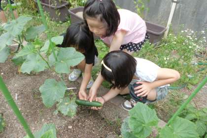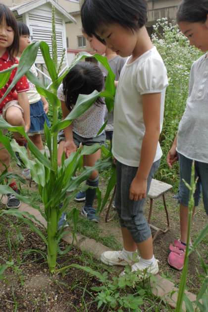 学校園で育てている野菜が大きくなり,もう収穫できそうです。とうもろこしは,子どもの背を超える勢いで伸びています。