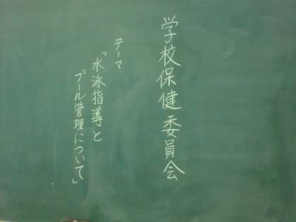 学校保健委員会とは,学校医(内科,眼科,耳鼻科,歯科)と学校薬剤師,PTA,そして学校が,子どもたちのからだとこころの健康づくりや安全について意見交流する場です。昨日の第1回目は,プール安全管理委員会も兼ね,テーマを「水泳指導とプール管理について」とし,15名の方が参加してくださいました。詳しい内容については,7月の保護者向け保健だより「あおぞら」に掲載する予定です。お楽しみに!