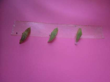 さなぎになろうとして,幼虫たちが,キャベツから離れていこうとするので,パックの中に移動させました。次々とさなぎになっています。無事成虫になってほしいです。