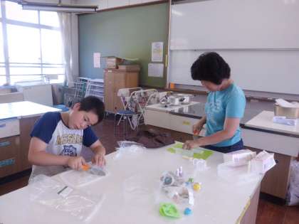130人近くのお友だちがクイズに挑戦してくれたことへの喜びから,はりきって景品作りに取り組む2人でした。前回作った時の手順をしっかりと覚えていて,指示されなくても自分たちでどんどん作業を進めていく姿がとてもたのもしかったです。