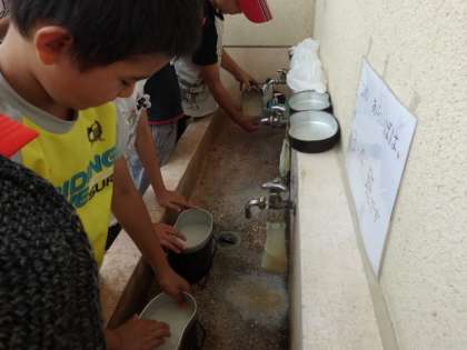 飯ごうの中にお米を入れて洗ったり,野菜を切ったり。