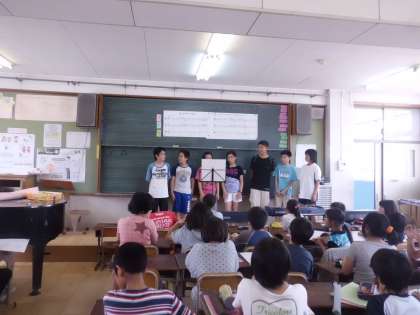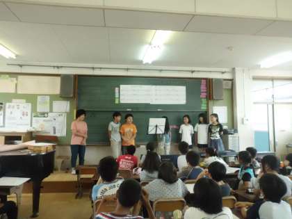 音楽の時間に「ロックマイソウル」をグループごとに練習し,みんなの前で発表しました。グループごとの工夫がたくさんあって,聞いていても楽しかったです。「うたがうまかったです。」と感想を言ってもらい,照れた様子のMくんでした♪