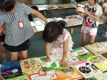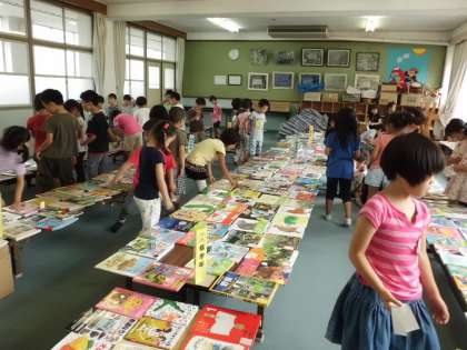 今日は選書会がありました。多目的室に並んだ,たくさんの本!この中から図書室に入れてほしい本を1冊ずつ選びます。