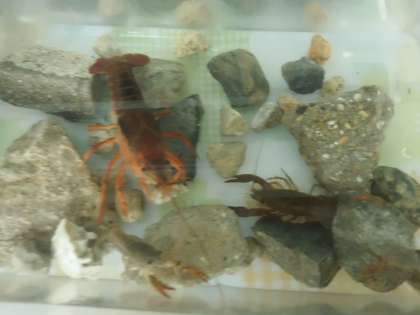 ザリガニです。名前はまだないそうです。子どもたちは,えさをあげたり,水を替えたり世話をしています。まだ名前はないので,どんな名前になるのか楽しみです。