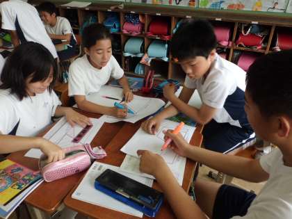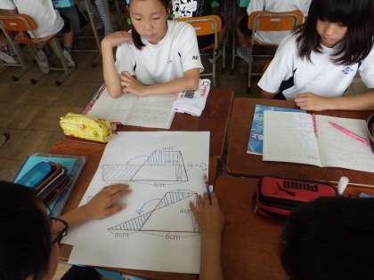 今日は,文字を用いた台形の面積を求める公式から,それぞれの式の意味についてグループごとに話し合い,検討しました。図に線を入れたり,説明文を入れたりしながら,熱心に話し合っている様子でした。