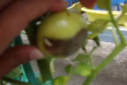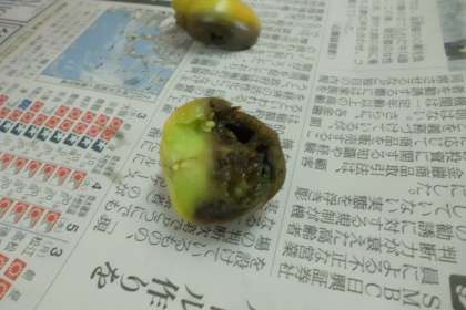 育てているトマトに異常発生!トマトのおしりがまっ黒け。調べてみると,「尻腐れ病」という病気でした。今年は暑くなるのも早く,ぐんぐん大きくなったので,栄養が足りなくなったようです。急いで肥料を追加しました。「中がどうなっているのか見てみたい!」と興味津々だったので,割ってみると,中までまっ黒けでした。病気にならないように大事に育てようね。