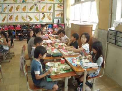 授業が終わった後は,一緒に給食も食べました。