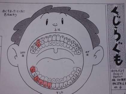 虫歯のこわさについて学び,自分の歯みがきのしかたをふりかえりました。汚れが残っている場所が赤く染まる薬をつかって,みがきのこしをチェックしました。今夜から赤く染まった場所に気を付けてみがいてほしいと思います。