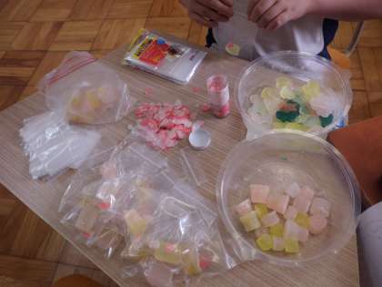 わかばクイズに挑戦してくれた人へのプレゼント作りをコツコツと進めています。今日は袋づめ作業をしました。「(お気に入りの形のものが)だれに届くのかなぁ」と想像をめぐらせながら作業を進めていました。