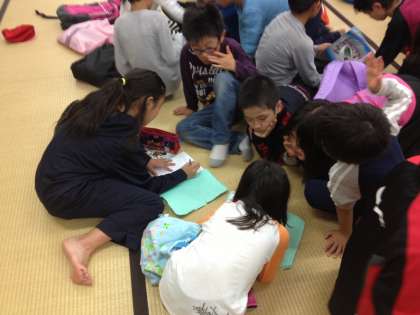 各係でのミーティングを,それぞれの班に持ち帰り,班でミーティングをしています。2日目でもあって,みんな協力して話し合いができています!