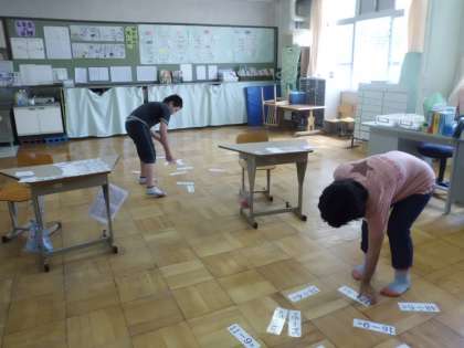ひとりひとりの課題に応じた「計算かるた」を使って,計算練習をしています。「自分の記録に挑戦しよう!」と頑張っています。お友だちの答えが合っているかどうか判定する役をしたりもしています。