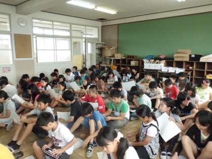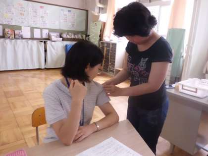 明日のスマイル集会(校内オリエンテーリング)に向けて,6年生の役割についての話を聞きました。低学年のお友だちにバッチをつけてあげる仕事もあるということで,教室に帰ってから練習をしました。