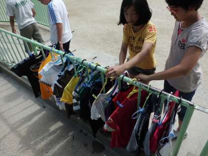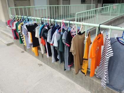 洗濯後は,ハンガーにかけ,干しました。天気が良かったこともあり,昼過ぎにはほとんどの衣類がかわいていました。今回の実習で学んだことを,家の洗濯でも今後生かしてほしいと思います。