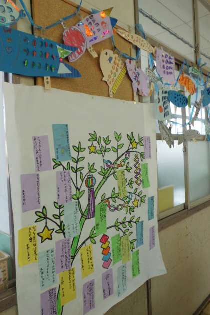 7月といえば七夕!ということで,七夕飾りを作りました。「大きなザリガニがとれますように」「せかい一のびようしになれますように」「おじいちゃんの病気がなおりますように」「おうちの店のおきゃくさまがふえますように」「友だち100人つくれますように」いろいろな願いごとがあってすてきです。自分以外の人のことを願う子もいて,優しいですね。