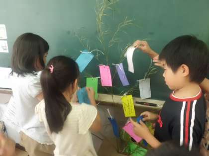 もうすぐ七夕ということで,短冊にお願い事を書いて笹に飾りました。「先生になりたい」「パソコンがほしい」「走りが速くなりたい」など様々なお願いを書きました。