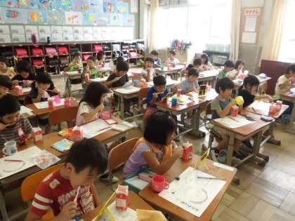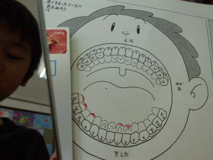 5時間目,カラーテスターを使って,じょうずに歯磨きができているかをチェックしました。給食後,いつも以上に念入りに歯磨きをしている1年生。でも,カラーテスターを口の中に入れてみると・・・歯の付け根や奥歯,歯の裏側など,赤くなっているところがありました。「ちゃんとはみがきしたのに〜!」と子どもたちもびっくりしていました。