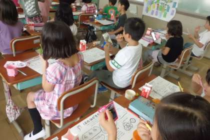 今日は,歯磨き指導をしました。普段通り歯磨きをし,「よし!完璧!」と思って薬で歯垢の染出しをすると…「うわ,めっちゃ赤くなってる。」「歯と歯茎の間が濃いよ。」「歯と歯の間もすごいよ!」「前歯はあんまり染まってないね。」自分の歯とにらめっこしてじっくり観察できました。「こうやって染めないと,なかなか磨き残しは分かんないよ。毎日染めたいなぁ。」なんて言っている子もいました。