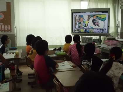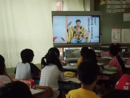 狂言独特の言い回しや言葉づかいに,始めは少し抵抗のあった様子の子どもたちでしたが,柿山伏を子ども向けにわかりやすく解説したビデオを見せたところ,「そういうお話だったのか!」「柿山伏って面白い!」と,子どもの反応は一転しました。