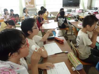 同じ糖度の砂糖水と炭酸飲料の飲み比べもしました。同じ糖度ですが,常温の砂糖水はとても甘く感じ,また,良く冷えた炭酸飲料は「おいしい甘さ」だと子どもたちは言っていました。炭酸飲料500mLに,たくさんの砂糖が使われていることに,子どもたちはとても驚いていました。