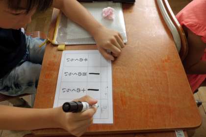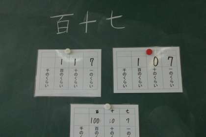 算数で,100より大きい数の学習をしました。読み方から数字に直したり,十のまとまりがない数字の書き方を学習したりしました。友達の答えが色々出てきました。どれが正しいのかな?
