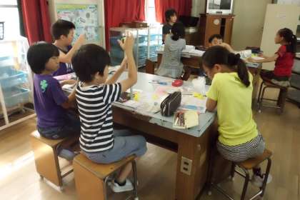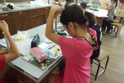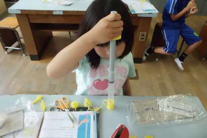 つつに空気をとじこめて,おしぼうをおしたときの手ごたえを調べました。