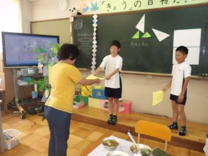 先週あったリレー大会の表彰状を体育委員さんが届けに来てくれました。嬉しそうに受け取り,教室に飾りました♪