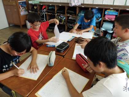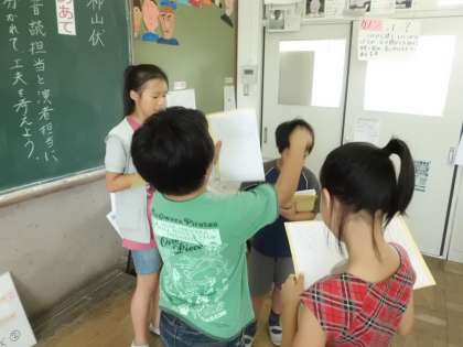 国語の学習で「柿山伏」を学習しています。これから実際に狂言をやってみます。今日は台本を作り,グループごとにセリフを言う人と役を演じる人に分かれてそれぞれの工夫について考えました。