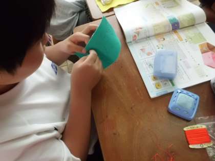 家庭科で習った縫い方を使って,一人一人が小物作りに挑戦しました。