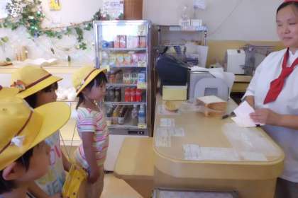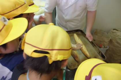 生活科の校区たんけんで,スズパンさんへインタビューをしに行きました。パンの焼けるいいにおいに囲まれながら,「期間限定のパンはありますか。」「パンを作るのにどれぐらい時間がかかりますか。」などと質問をしました。店長さんは朝方の3時から起きて仕込みをされており,子どもたちはびっくりしていました。また,丸一日かけて作るパンもあることを知り,「パンを作るのに時間がかかるんやなぁ。」と感想を述べていました。