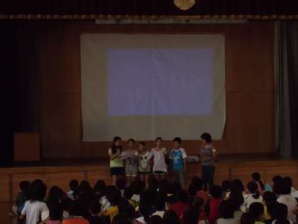 サマー集会がありました。前半は3〜4グループごと(スマイル集会の教室ごと)に6年生が考えた遊びをしました。スイカ割り・爆弾ゲームなどを楽しみました。後半は体育館に全員集合して集会委員さんの出し物を楽しみました。
