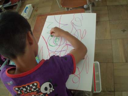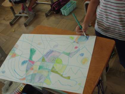 波のような線や曲線,ジグザグ線などを自由に描き,それによって出来た空間に色をつけていきます。
