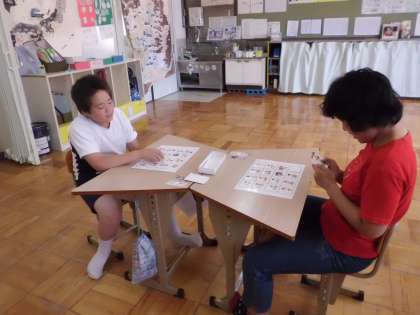 国語の時間に「おはなしビンゴ」に挑戦しました。絵カードをビンゴ用紙の上に並べて準備し,机の真ん中においた問題カードを引きます。ひいたカードは友だちに見られないようにして絵を見てお話を作ります。お話を聞いている人は自分のビンゴ用紙のカードを見て,お話にあったカードがあったら引っくり返します。裏返したカードが1列そろったらビンゴの完成♪