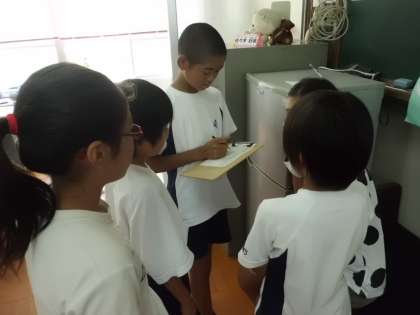 健康安全委員会の仕事の1つに,「休み時間に保健室に来た児童の健康チェック」という仕事があります。こっそりのぞいてみました。しんどくなった人の体調を気遣いながら,カードに記入する姿がありました。