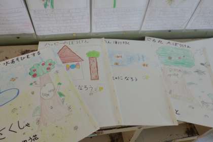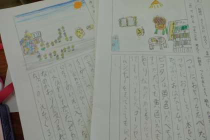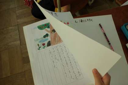 国語「お話のさくしゃになろう」では,「はじめ」「中」「おわり」の展開を意識して,物語を作っています。26人26通りのストーリーが出来上がっています。題名や表紙などもつけて本らしくなり,「世界に一つだけの本だ。」「色んな人に読んでほしい。」「家に持って帰って妹に読んであげたい。」などと,本の出来に満足している様子です。