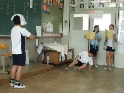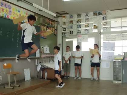今日は狂言「柿山伏」の発表会をしました。読み方や顔の表情まで工夫しながら,グループごとに楽しんで発表していました。初めは狂言に対して難しいイメージをもっていた子どもたちでしたが,実際に狂言を体験してみたことで,狂言がより子どもたちにとって身近なものとなったのではないでしょうか。