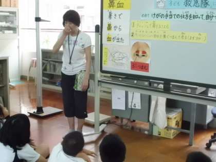 計測の前には養護の先生からけがの手当てについても教えてもらいました。