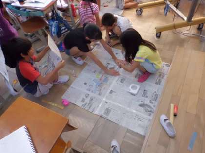 今日は先日学習した1平方メートルについて,どれくらいの大きさか確認するために,新聞紙を使って実際に1平方メートルの大きさを作ってみました。