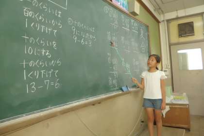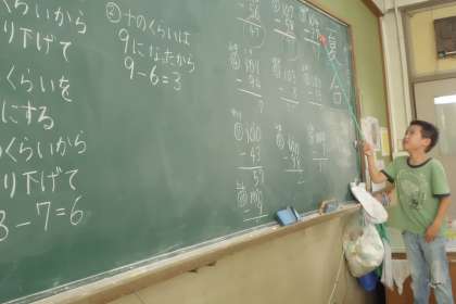 算数では,足し算と引き算の筆算を学習しています。「まず,一の位から計算して…」「十の位に1繰り上げて…」などと,みんなに分かりやすく説明できるようになりました。