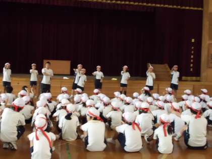 体育館では応援練習をしました。その後,スマイル競技3つ(玉入れ・綱引き・台風の目)のうちどの競技に参加するかを相談して決めました。わかばっ子2人のグループは両方とも綱引きに出場することになりました。