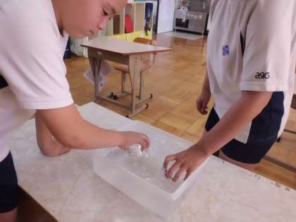 理科の時間に「空気」の実験をしました。普段目に見えない空気ですが,水とびん・スポンジを使って空気を見つけました。大きな泡が出きると大喜びの2人でした。