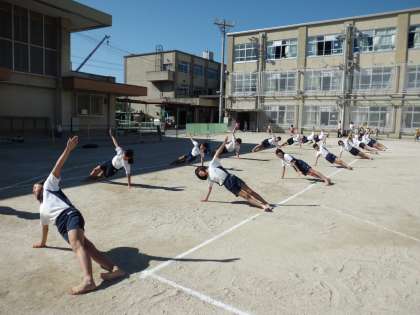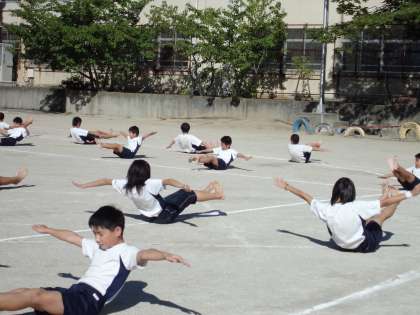 運動場で組体操