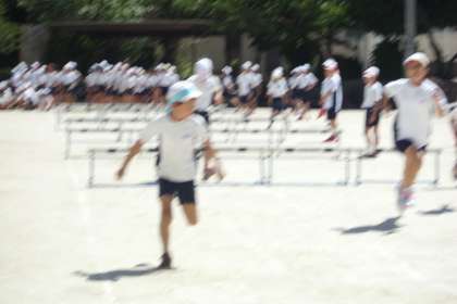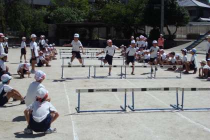 今日のハードル走では,ハードルのインターバルを3歩で走る練習をしました。