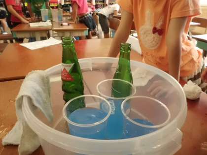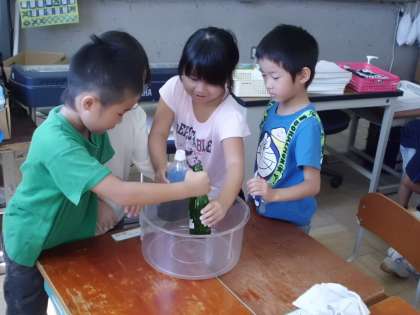 算数単元「おおきさくらべ」でかさくらべをしました。ペットボトルとびん,どう見てもびんの方がおおきそうだけど・・・調べてみると,ペットボトルの方がたくさん水が入ることがわかりました。初めの予想と違っていて,子どもたちもびっくりしていました。