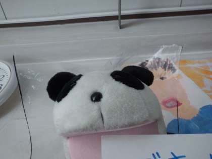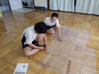 「身近なものを使って,いざというときに役立つ防災グッズを作ろう!」の第1弾として今日は大きなビニール袋を使ってかっぱを作りました。「お〜。かっぱや。パンちゃん(わかば学級のキャラクター)にも作ってあげよう!」とパンちゃん用のかっぱも作ってあげる優しい2人でした♪