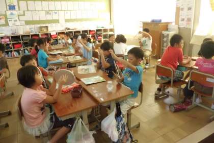 音楽「虫のこえをつくろう」では,虫になったつもりで,楽器だけを使って友達とお話をしてみました。「あそぼ,はタンタンタンだよ。」「中間休み何する?って聞いたら,ちゃんと返事が返ってきた!」と嬉しそうに音を鳴らしていました。