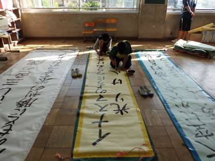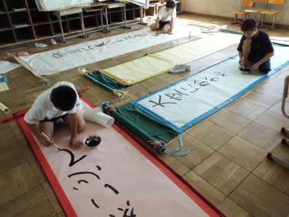 計画委員会の児童で,先日決定した運動会スローガンを書きました。今日作ったスローガンは,運動会当日にお披露目します。どうぞお楽しみに!