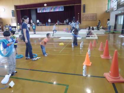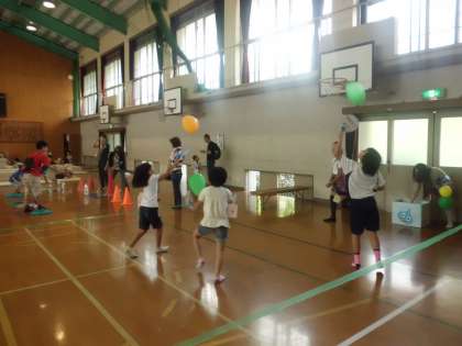 風船を使って「うちわでGO」「紙ひこうき」「わなげ」身体をいっぱい使って遊びます。