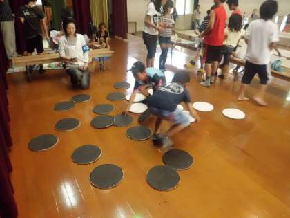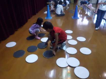 体育館のステージでは,「大きなオセロ」コーナーがあります。