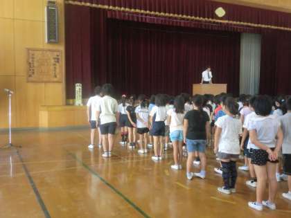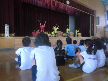 11日(金)で前期が終わりました。終業式では和太鼓クラブの演奏も聞きました。「かっこいいなあ」と言いながらじっくり鑑賞する2人でした。